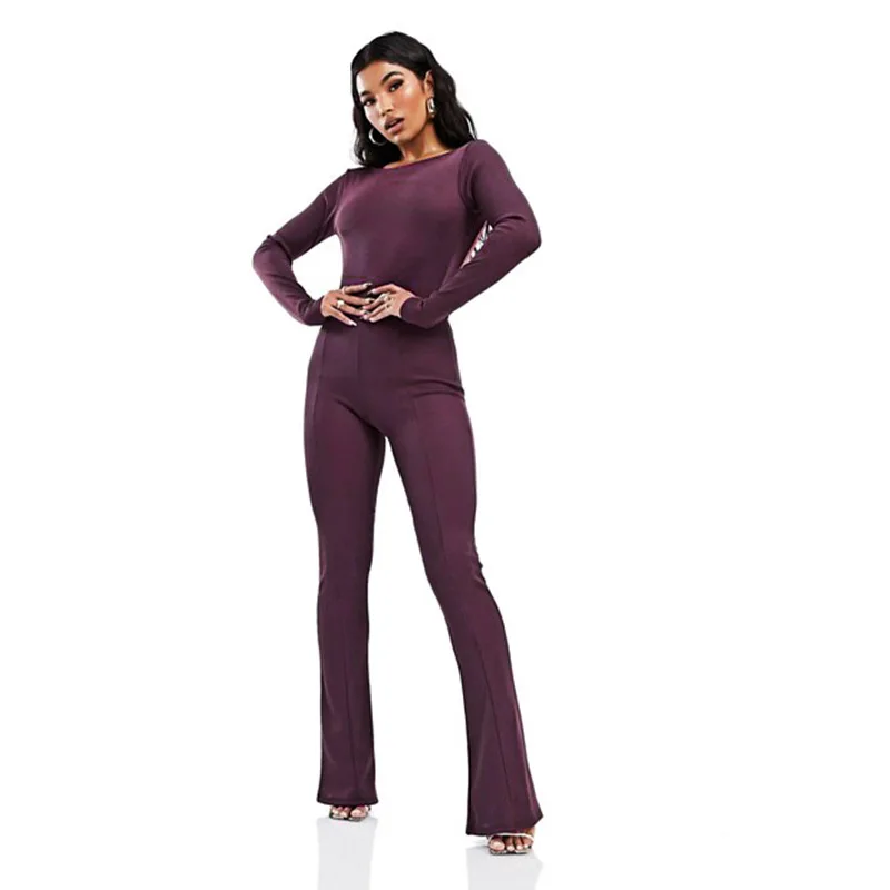 Free shipping 2021 Spring Woman Sexy Tights Jumpsuit Round Neck Pullover Bodycon Backless Bodysuit Slim Outfit Rompers Long Pants Jumpsuits
